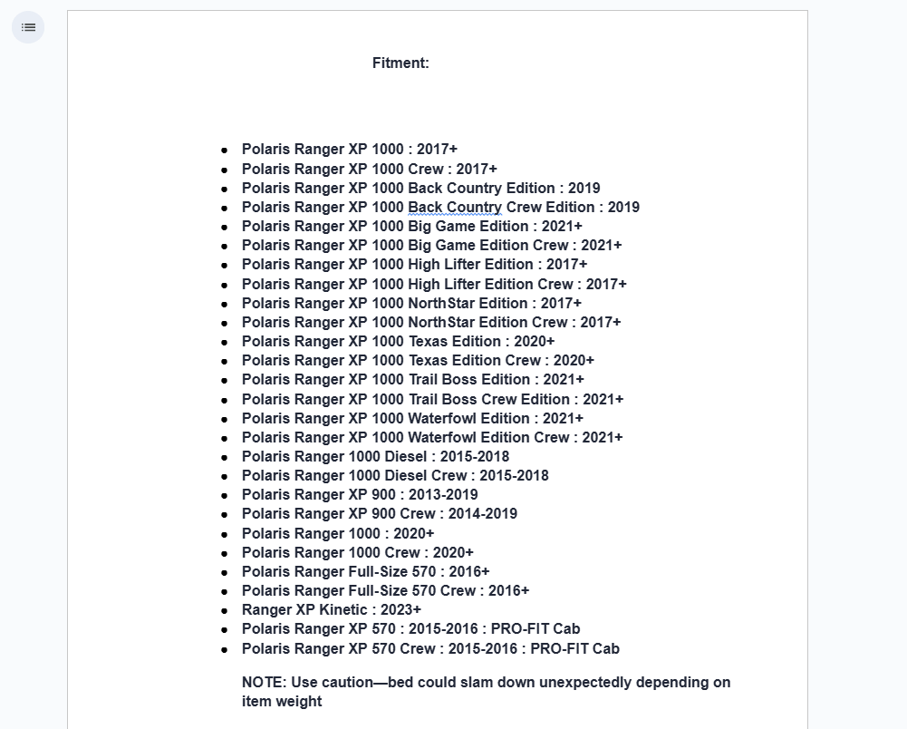 | Polaris | Ranger XP 1000 | -- | 2017 | |