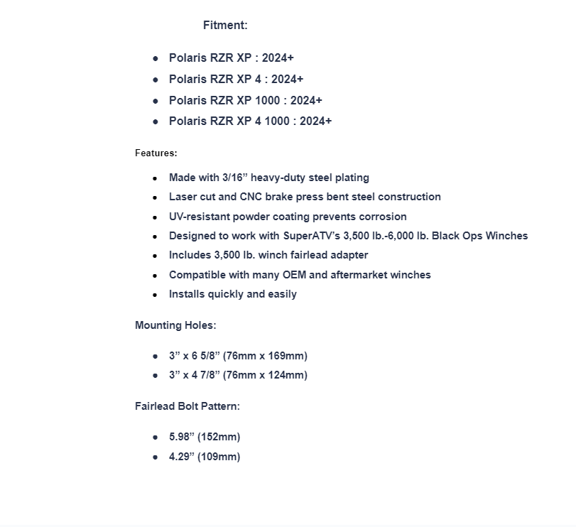 - Designed to work with SuperATV’s 3,500 lb.-6,000 lb. Black Ops Winches