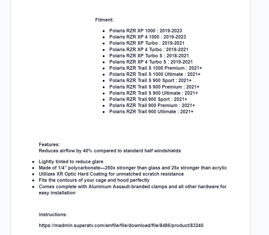 For optimal defense, add Assault Industries’ Half Windshield to your RZR XP 1000. It gives you unbeatable protection while turning your cab into a badass cockpit. Thanks to its aerodynamic design and reliable construction, airflow into your cab is reduced by up to 40% compared to any other half windshield on the market. With this half windshield added to your machine, you will be victorious!