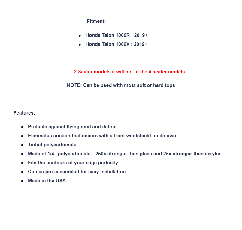 SuperATV Dark Tint Rear Windshield For Honda Talon 1000 R/X – 2 Seater