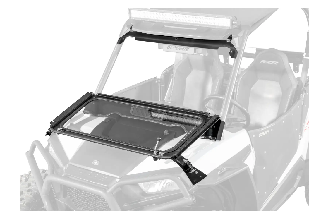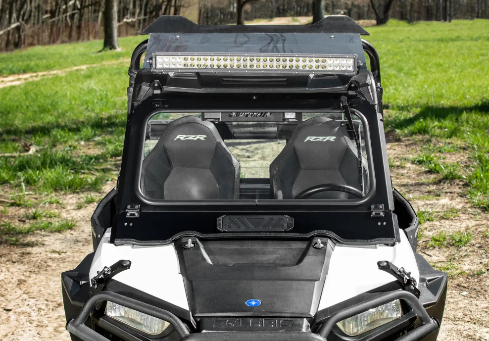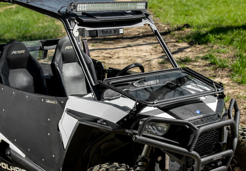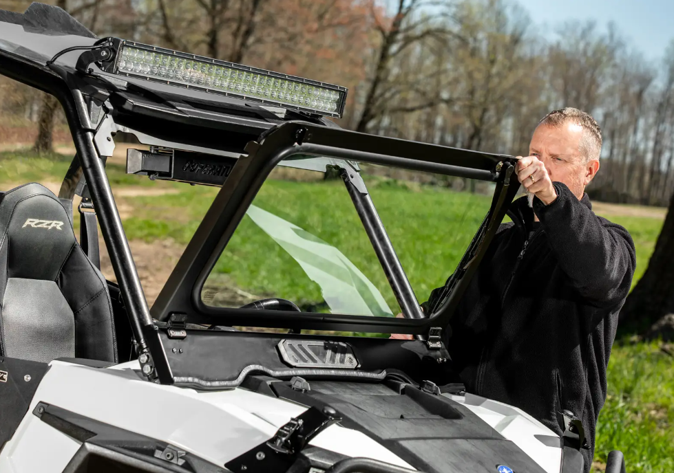 A durable flip down glass windshield used to be a pipe dream, but not anymore! At SuperATV, we’ve engineered a Polaris RZR XP 1000 Flip Down Glass Windshield that won’t crack under pressure. We use a clever combo of rubber gaskets and high-strength steel to make our windshield better than the competition. A flip down windshield moves between two positions: locked upright like a standard windshield and fully lowered. That flexibility gives you maximum control over airflow—open ‘er up to feel the breeze or close it for protection from the elements. We use DOT-approved glass and include a manual wiper and a BreezeRite vent. It’s pretty much the best windshield out there.