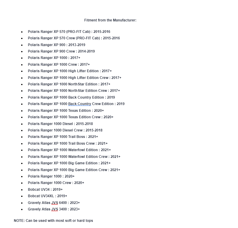 - Polaris Ranger XP 570 (PRO-FIT Cab) : 2015-2016