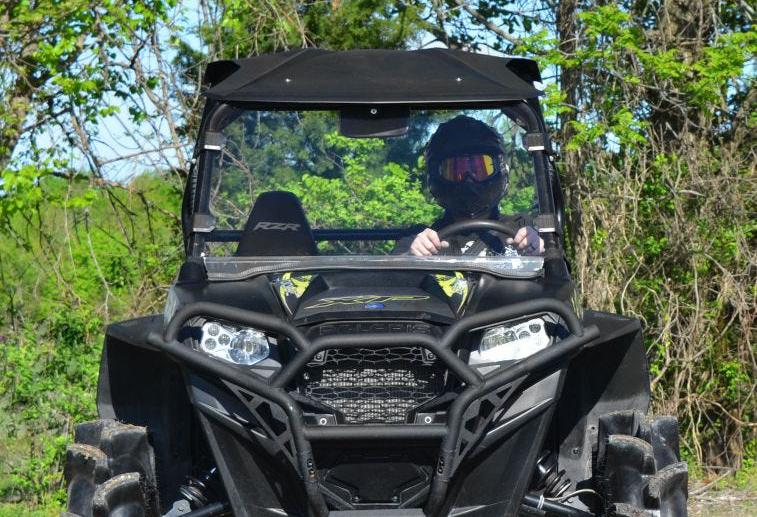 When it comes to UTV windshields, our motto is “go polycarbonate or go home.” Our 1/4”-thick polycarbonate windshields are twenty-five times stronger than acrylic and 250 times stronger than glass. Such high levels of strength and impact resistance let you go hard on the trails without worrying about your windshield shattering in case of an unfortunate rollover.
