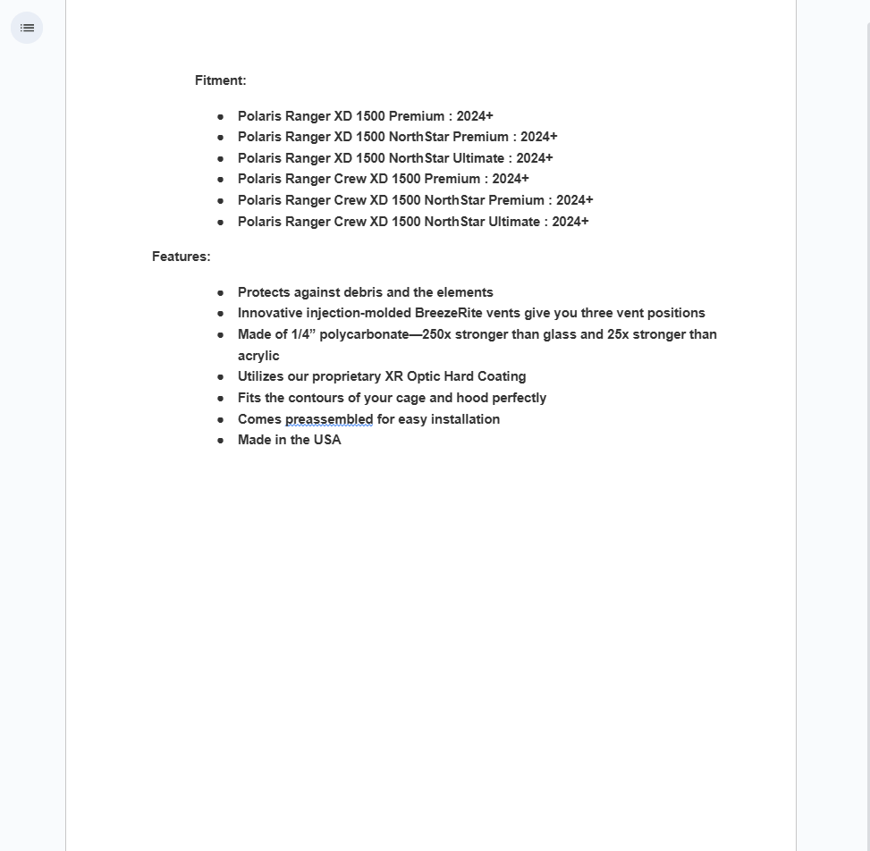 We make our poly even better by coating it on both sides with our proprietary XR Optic Hard Coating. It adds unbeatable scratch resistance to prevent marring and hazing through regular use. It’s the protection a Ranger XD 1500 vented windshield needs.