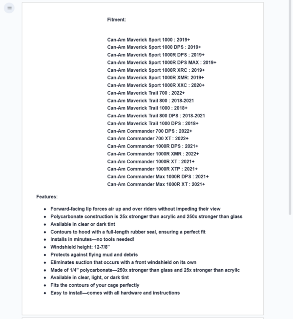 This half windshield is made with 1/4” polycarbonate for unbeatable strength and it looks great. We want you to get a utv windshield that matches your style and makes your buddies think twice about going anywhere else. That’s why we offer both clear scratch-resistant polycarbonate and our standard dark-tinted option. No matter what you choose, your Maverick Sport windshield will be It’s sleek, stylish, and strong—and you won’t find a better option anywhere else.