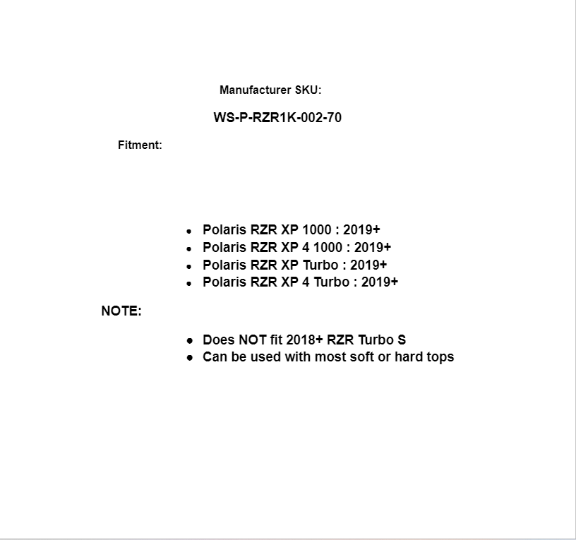 - Does NOT fit 2018+ RZR Turbo S