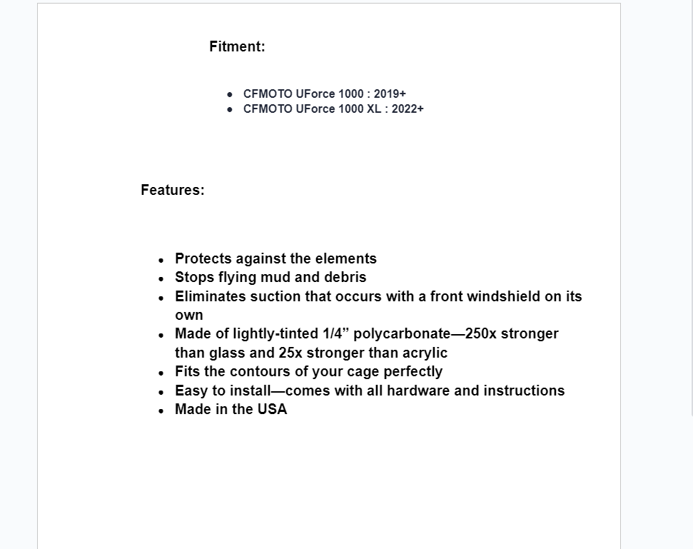 The cab of your CFMOTO UForce isn’t complete without a rear windshield. SuperATV’s CFMOTO UForce 1000 Rear Windshield can prevent suction and dust swirl caused by a front windshield. Maximize your comfort with this windshield—it will protect you from foul weather all year round, and it keeps any debris your rear tires might kick up out of your cab.