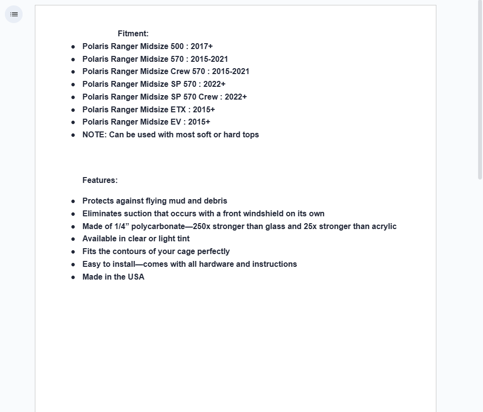 When it comes to UTV windshields, we don’t use anything that’s not polycarbonate. These 1/4” polycarbonate sheets are 250 times stronger than glass and twenty-five times stronger than acrylic, which makes them virtually unbreakable. You’ll never have to worry about this windshield cracking or shattering in case of an unfortunate rollover or collision.