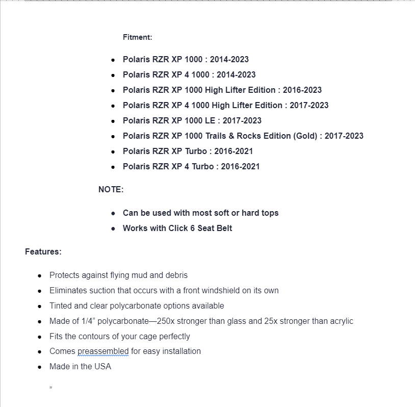 We use polycarbonate for our windshields because it’s the perfect side-by-side material. It’s 250 times stronger than glass so no matter how big the clods of dirt are that you kick off your rear tires, this windshield won’t break.
