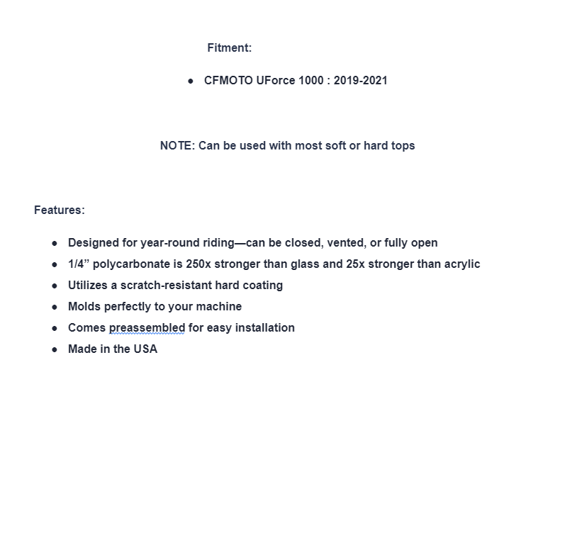 You deserve a machine that’s versatile and ready to take on anything, rain or shine. Whether you’re riding for work or for fun, the last thing you want is the weather messing up your plans. So don’t leave your off-road adventures at the mercy of Mother Nature! Get our Scratch-Resistant Flip Windshield for your CFMOTO UForce 1000 today, and you’ll spend all year thanking yourself for it. Its multi-stage latching mechanism lets you switch its position without ever leaving the comfort of your cab. Keep it fully closed on those frigid winter days, use it vented to enjoy a breeze while staying protected from the elements, or prop it open to enjoy that open-cab feel. The weather is unpredictable, but your ride doesn’t have to be.