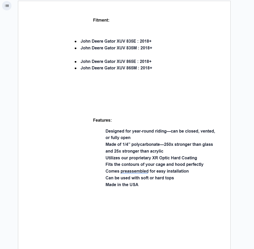 Poly is tough enough on its own, but we wanted to make this the best damn John Deere Gator Windshield on the market. That’s why we finish it with our proprietary XR Optic Hard Coating. This invisible coating provides high levels of scratch resistance on both sides of the windshield. It’s also UV resistant so you get great clarity after years of abuse.