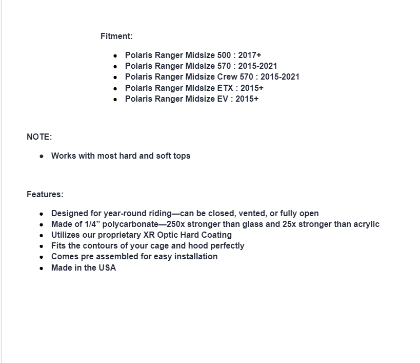 Hitting the trail in your Polaris Ranger Midsize doesn’t have to mean compromising your comfort if the weather’s bad. Get SuperATV’s Scratch Resistant Flip Windshield and switch to the setting you need to match the weather. Hot out? Keep it fully open. Rainy? Keep it closed. Need just a little air? Vent it! Whatever nature throws at you and your Ranger, our windshield is ready for it.