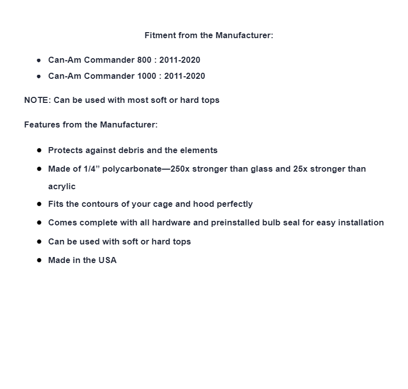 When you take your Can-Am Commander off the beaten path, you need SuperATV’s Full Windshield to deflect debris and keep dust out of your face. We make it with scratch-resistant polycarbonate so it will deflect every branch and boulder you come across. Our scratch-resistant hard coating is second to none so ride on dusty trails and down paths with low-hanging branches without gouging up your windshield. You get a Can-Am Commander windshield that rocks without draining your wallet.