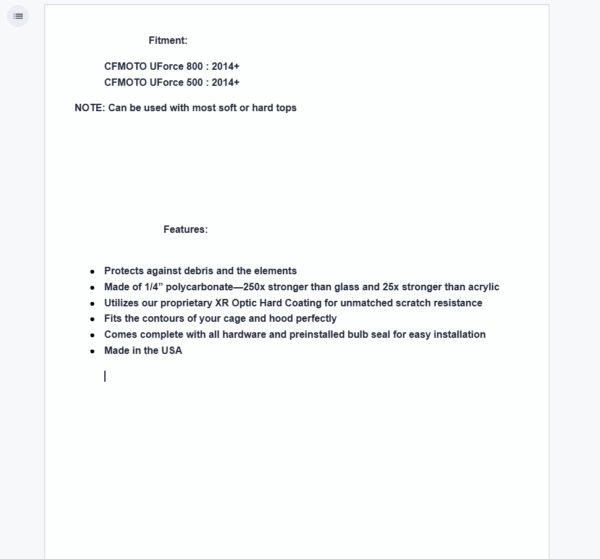 When you take your CFMOTO UForce 800 off the beaten path, you need SuperATV’s Full Windshield to deflect debris and keep dust out of your face. We make it with scratch-resistant polycarbonate so it will deflect every branch and boulder you come across. Our scratch-resistant hard coating is second to none so ride on dusty trails and down paths with low-hanging branches without gouging up your windshield. Ride through the rain, snow, and cold—with our full windshield, you’ll be comfortable and protected no matter what.