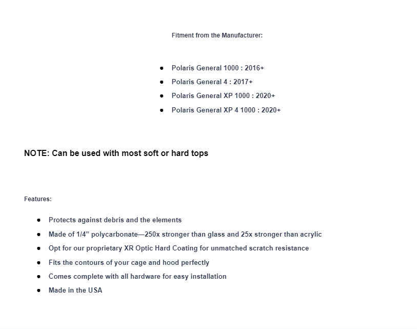 ”I’m sick of having a windshield,” said no one ever. Get complete protection from kicked-up rocks and limbs with a Scratch Resistant Full Windshield from SuperATV. Install it on your Polaris General and ride through rain, wind, and snow, all while staying comfortable and keeping safe from trail debris. It beats the heck out of any OEM windshield you can get, and it’s a better way to ride.
