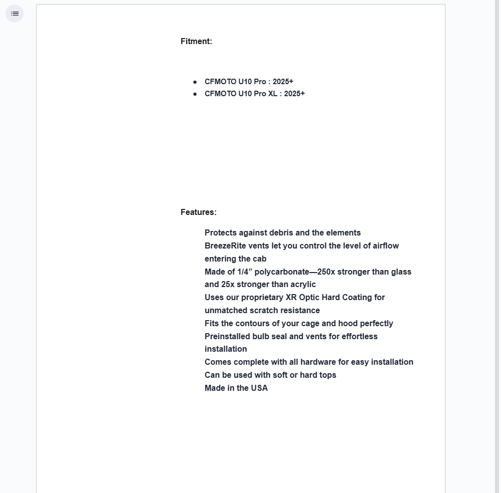 You want full protection from trail debris and the weather—but you also want to feel the breeze on a hot day. Get the best of both worlds with SuperATV’s Scratch-Resistant Vented Full Windshield for the CFMOTO UForce U10 Pro. It’s designed to give you total control over airflow with two BreezeRite vents—all without sacrificing protection.