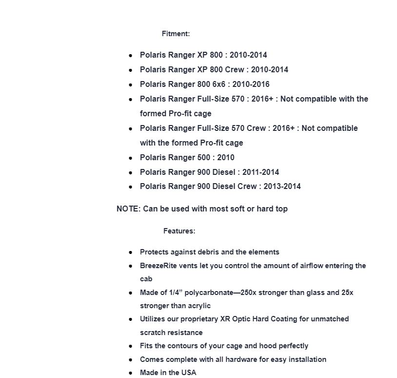 - Polaris Ranger Full-Size 570 Crew : 2016+ : Not compatible with the formed Pro-fit cage